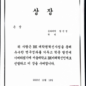 함진영 학생이 서울대학교 BK미래혁신인재 은상을 수상하였습니다.