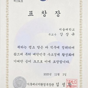 강상규 교수님께서 기후에너지환경부 수소경제활성화 유공 장관표창을 수상하셨습니다.